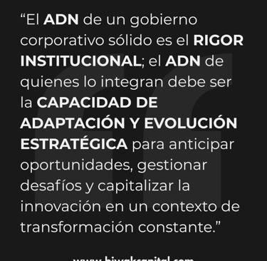 El ADN de un gobierno corporativo sólido es el RIGOR INSTITUCIONAL; el ADN de quienes lo integran debe ser la CAPACIDAD DE ADAPTACIÓN Y EVOLUCIÓN ESTRATÉGICA para anticipar oportunidades, gestionar desafíos y capitalizar la innovación en un contexto de transformación constante.