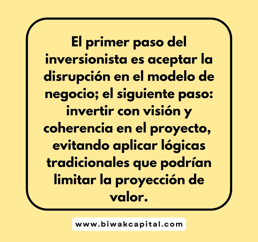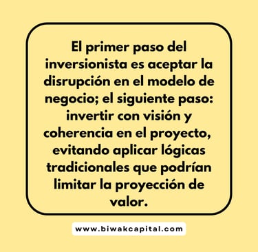 El primer paso del inversionista es aceptar la disrupción en el modelo de negocio; el siguiente paso: invertir con visión y coherencia en el proyecto, evitando aplicar lógicas tradicionales que podrían limitar la proyección de valor