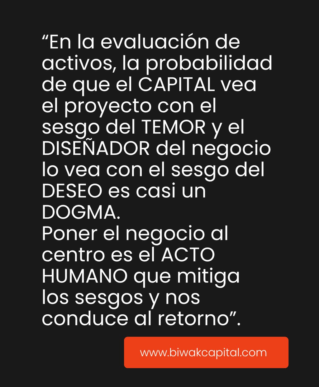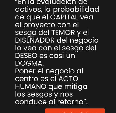 "En la evaluación de activos, la probabilidad de que el CAPITAL vea el proyecto con el sesgo del TEMOR y el DISEÑADOR del negocio lo vea con el sesgo del DESEO es casi un DOGMA. Poner el negocio al centro es el ACTO HUMANO que mitiga los sesgos y nos conduce al retorno"