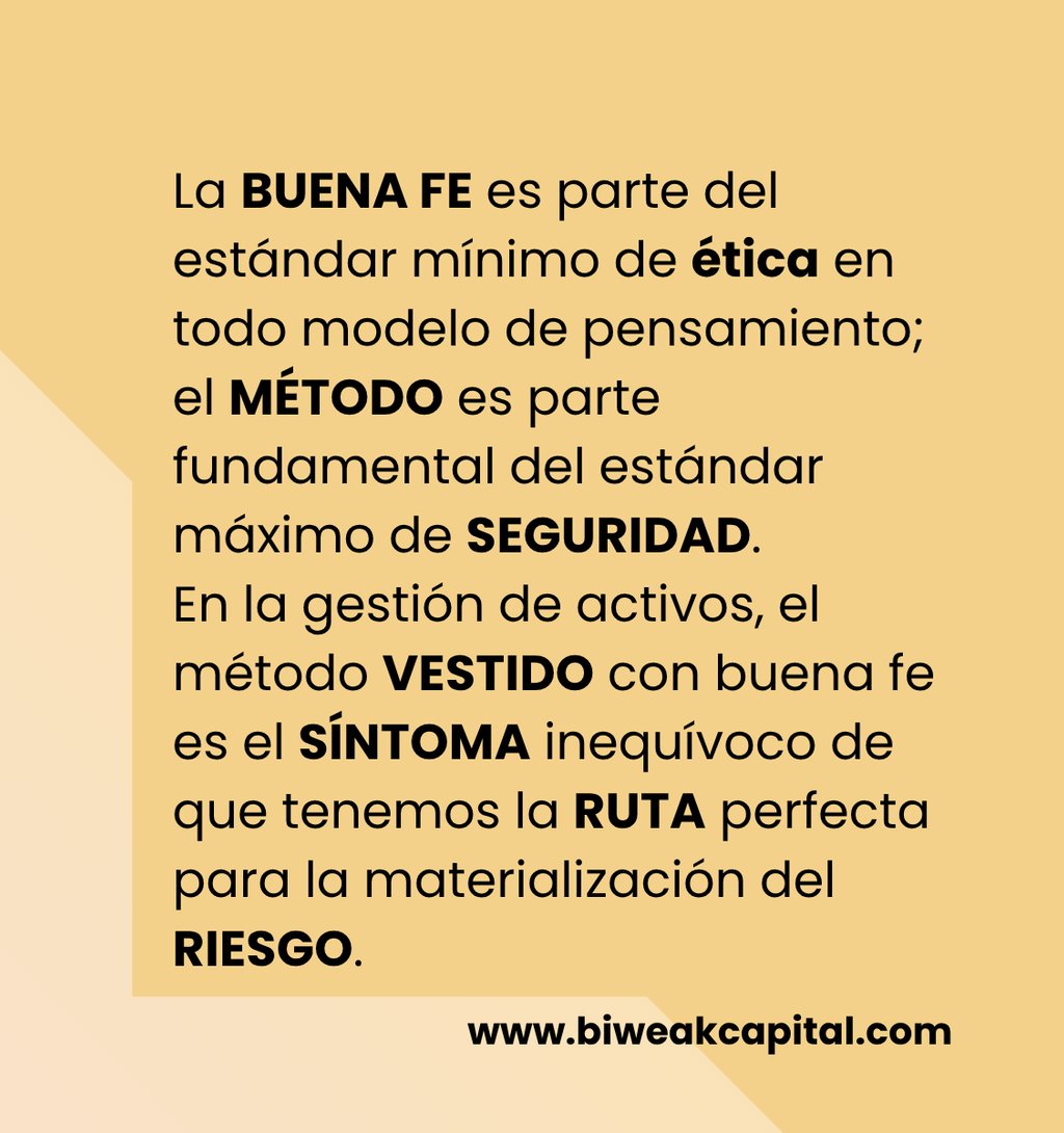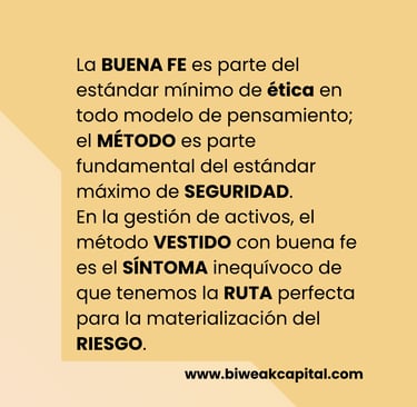 La BUENA FE es parte del estándar mínimo de ética en todo modelo de pensamiento; el MÉTODO es parte fundamental del estándar máximo de SEGURIDAD. En la gestión de activos, el método VESTIDO con buena fe es el SÍNTOMA inequívoco de que tenemos la RUTA perfecta para la materialización del RIESGO.