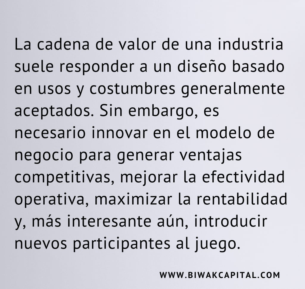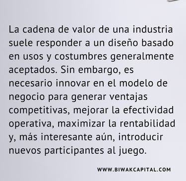 La cadena de valor de una industria suele responder a un diseño basado en usos y costumbres generalmente aceptados. Sin embargo, es necesario innovar en el modelo de negocio para generar ventajas competitivas, mejorar la efectividad operativa, maximizar la rentabilidad y, más interesante aún, introducir nuevos participantes al juego