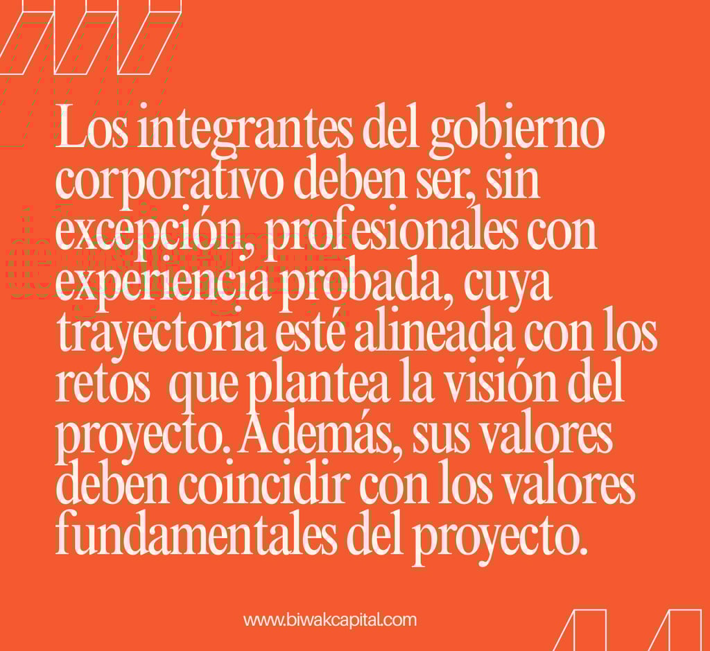 Los integrantes del gobierno corporativo deben ser, sin excepción, profesionales con experiencia probada, cuya trayectoria esté alineada con los retos que plantea la visión del proyecto. Además, sus valores deben coincidir con los valores fundamentales del proyecto.